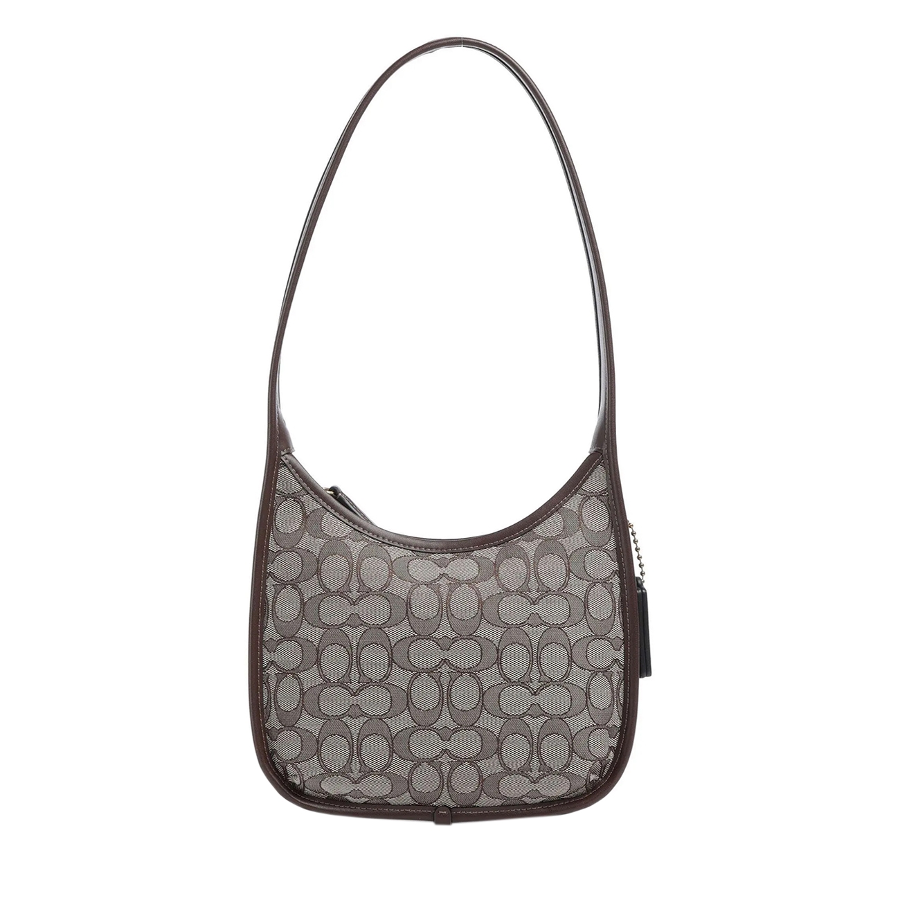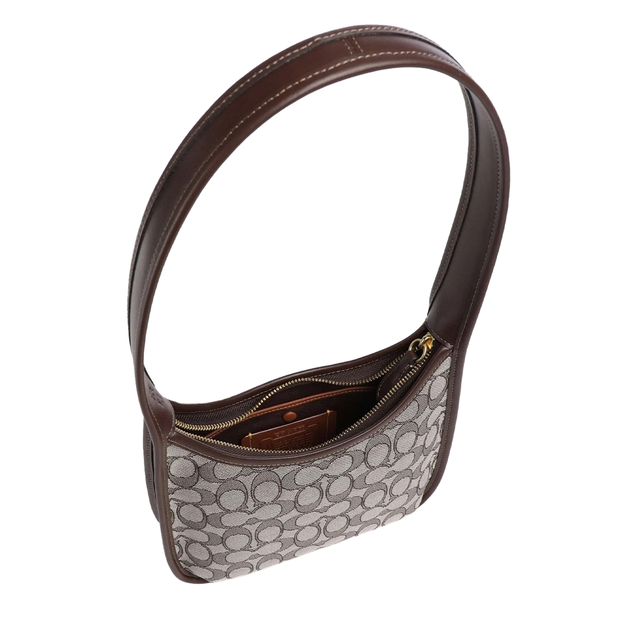 Geantă de umăr Coach, confecționată din material textil jacquard cu logo-ul iconic „C” și detalii din piele naturală. Are un design minimalist, compact, cu închidere cu fermoar și curea fixă, fiind alegerea ideală pentru ținute casual sau elegante.