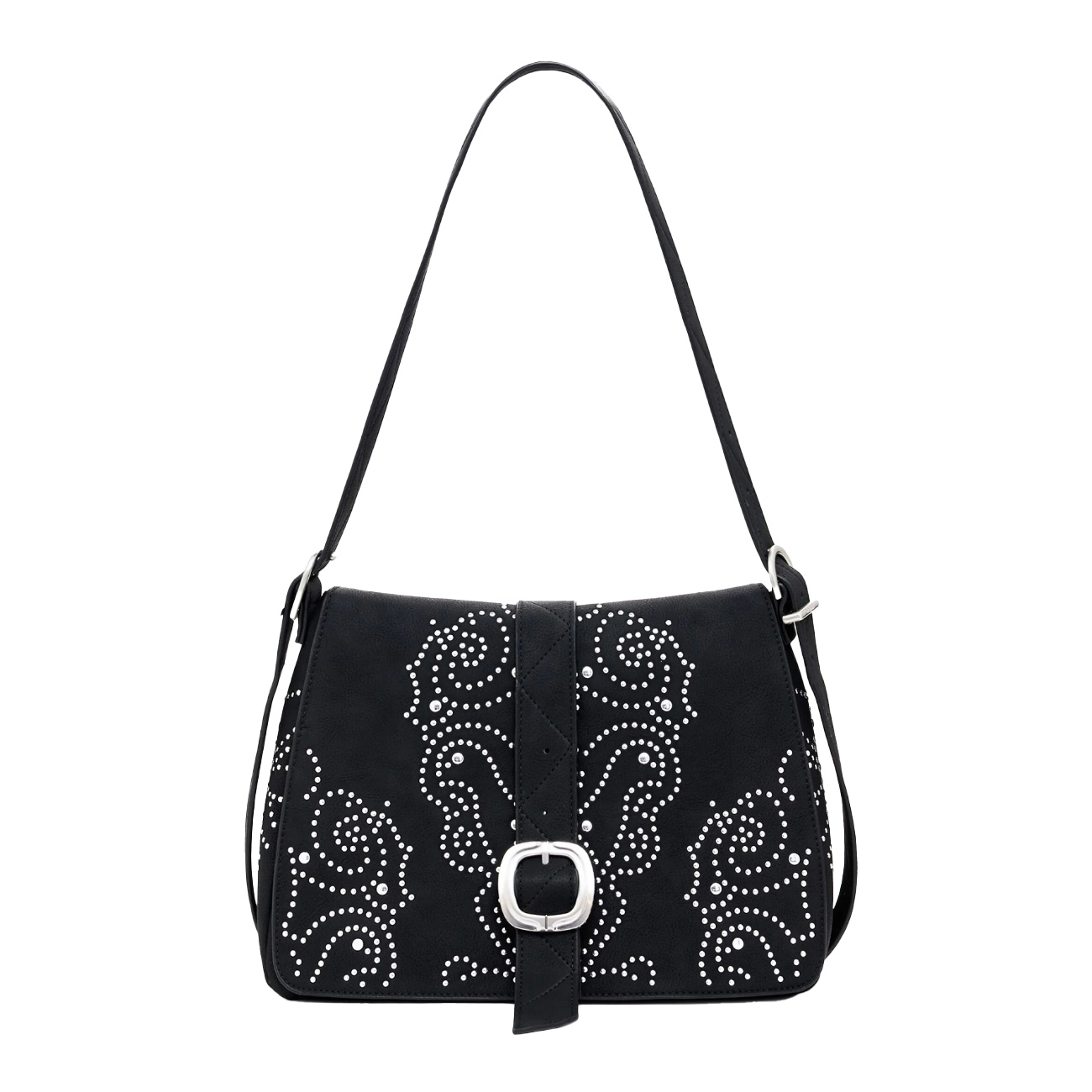 Geantă de umăr cu design elegant, realizată dintr-un material cu aspect mat, decorată cu aplicații de mici pietre strălucitoare care formează un model ornamental delicat. Modelul este accentuat în partea frontală de o curea decorativă centrală prevăzută cu o cataramă metalică lucioasă. Este prevăzută cu un compartiment principal cu fermoar și un buzunar exterior discret pe partea din spate. Poate fi purtată confortabil pe umăr datorită bretelei ajustabile.