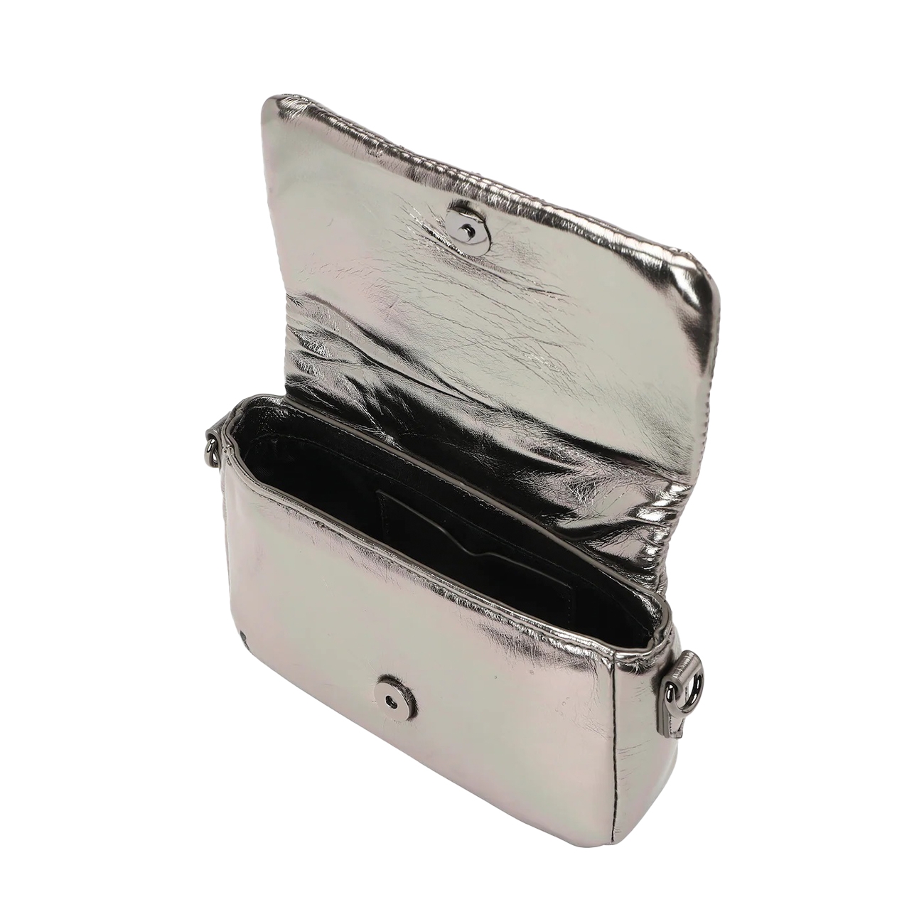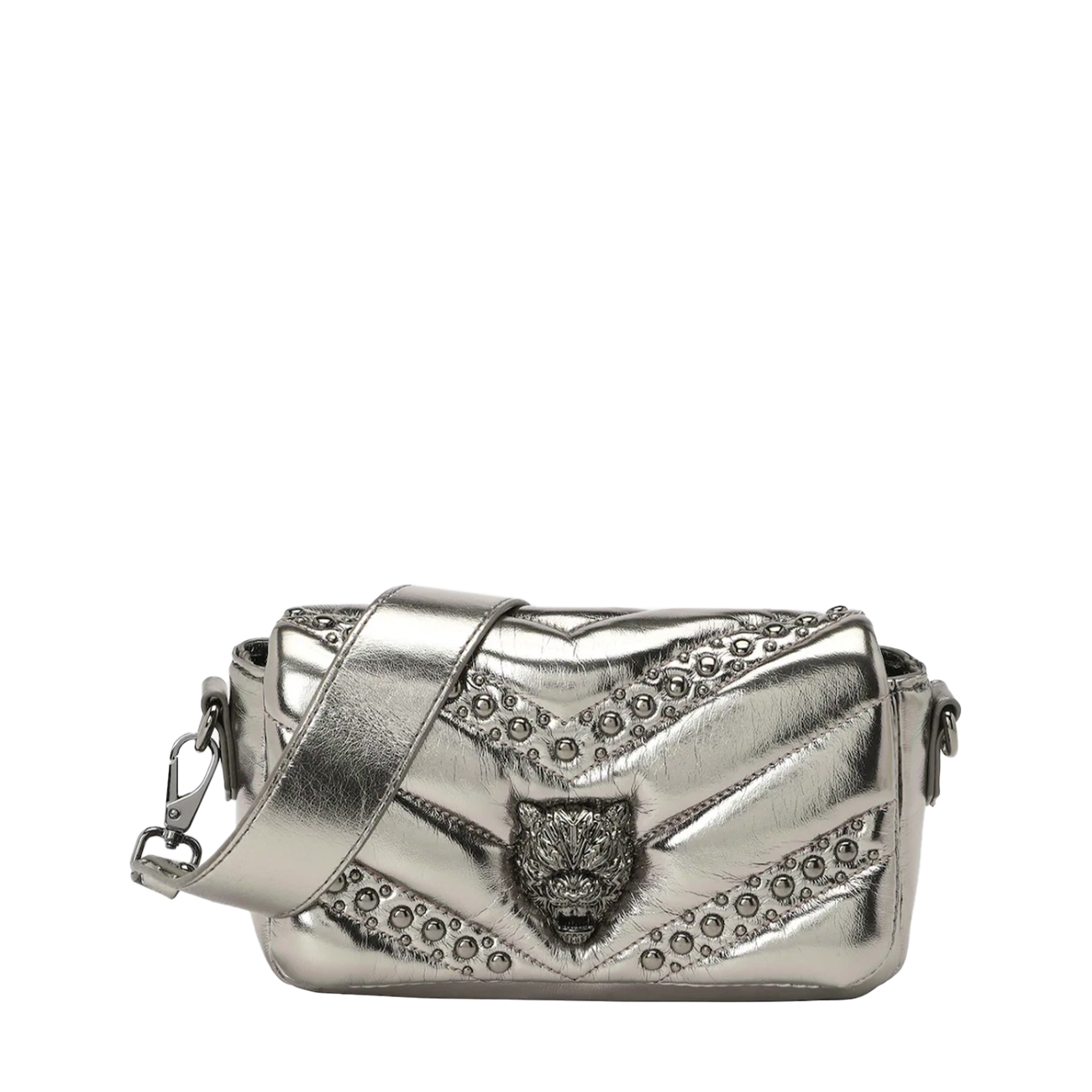 Un accesoriu statement care redefinește stilul sport-lux, geanta Plein Sport Small Flap Cady în nuanța gun metal atrage toate privirile prin detalii spectaculoase. Realizată din material sintetic premium cu aspect metalizat, geanta impresionează prin aplicațiile cu ținte decorative, cusături geometrice și emblematicul cap de tigru în relief — un simbol al puterii și al atitudinii.