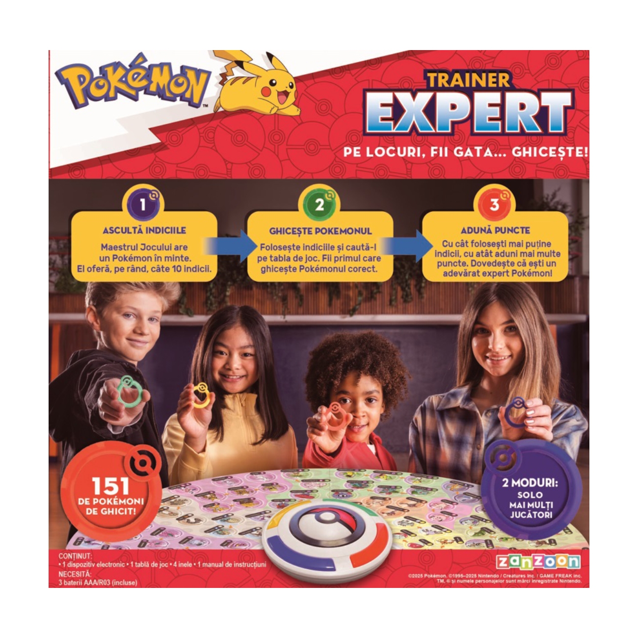 Jocul interactiv de societate aduce distracție și provocare pentru toți fanii universului Pokémon. Conceput pentru 2 până la 8 jucători, acesta pune la încercare cunoștințele și viteza de reacție printr-un concept simplu și captivant: unul dintre participanți devine Maestrul Jocului și oferă pe rând până la 10 indicii despre un personaj secret, iar ceilalți trebuie să îl identifice cât mai rapid pe tabla de joc. Cu cât ghicești mai repede, folosind mai puține indicii, cu atât câștigi mai multe puncte, iar scopul final este să demonstrezi că ești un adevărat expert.