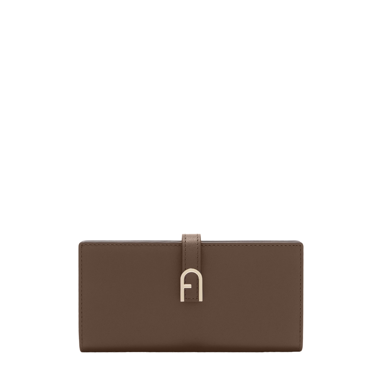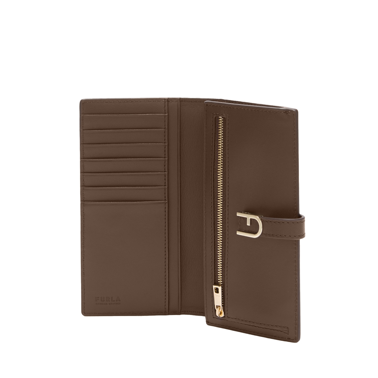 Portofelul compact Furla Flow este confecționat din piele Vitello Claris Lux, cu un finisaj neted și sofisticat, fiind ideal pentru utilizarea de zi cu zi. Designul său minimalist este completat de închiderea cu baretă decorată cu litera „F” metalică, emblematică pentru brand, și de un interior bine compartimentat pentru bancnote, carduri și monede.