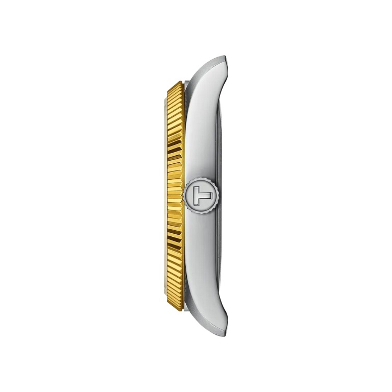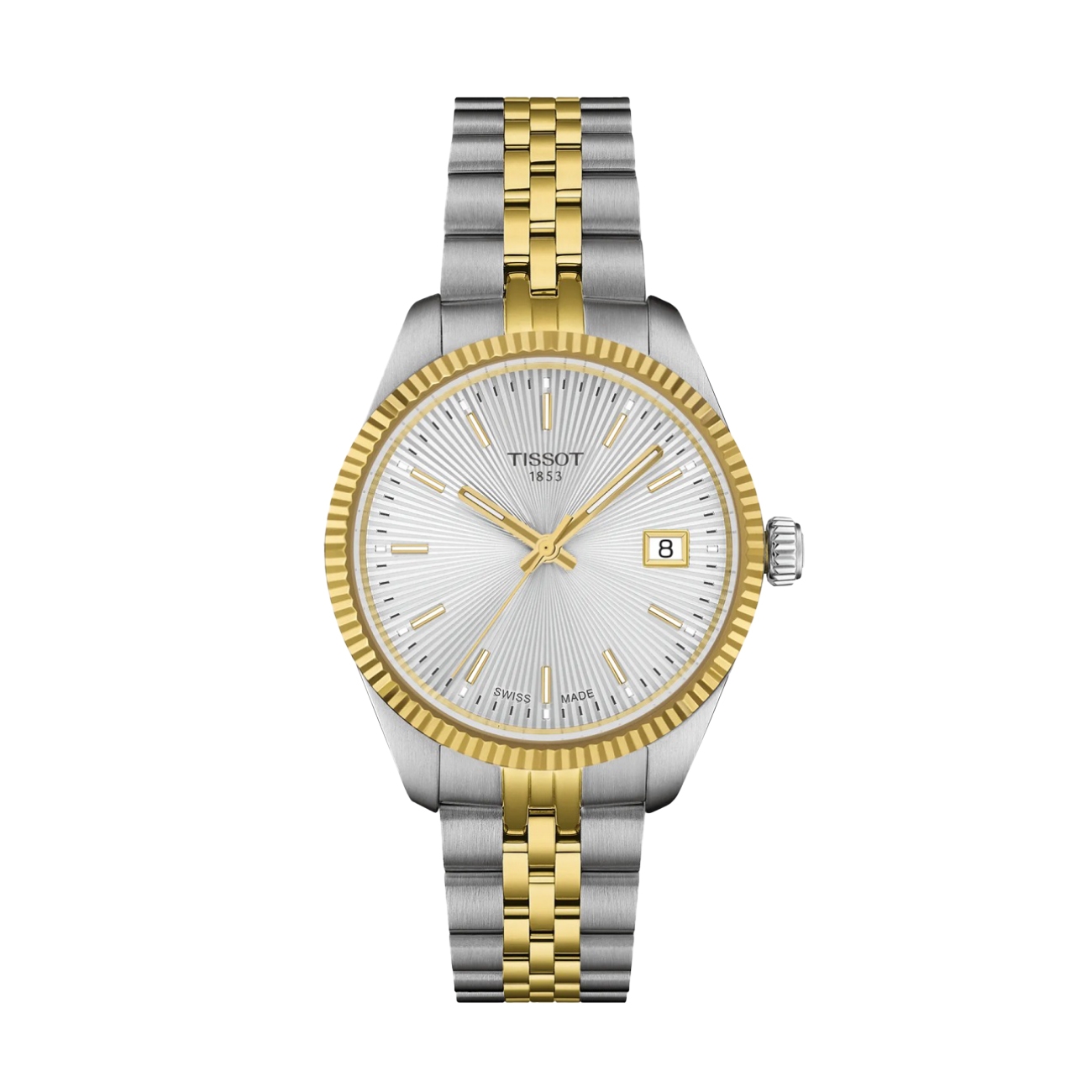 Carcasa din oțel inoxidabil este accentuată de o ramă aurie cu finisaj striat, care adaugă profunzime și caracter, iar brățara bicoloră — o combinație armonioasă de oțel și auriu — oferă o prezență elegantă și versatilă, potrivită atât pentru ocazii formale, cât și pentru purtarea zilnică. Cristalul din safir asigură protecție împotriva zgârieturilor, iar rezistența la apă de până la 100 metri (10 bar) confirmă robustețea și fiabilitatea acestui model.