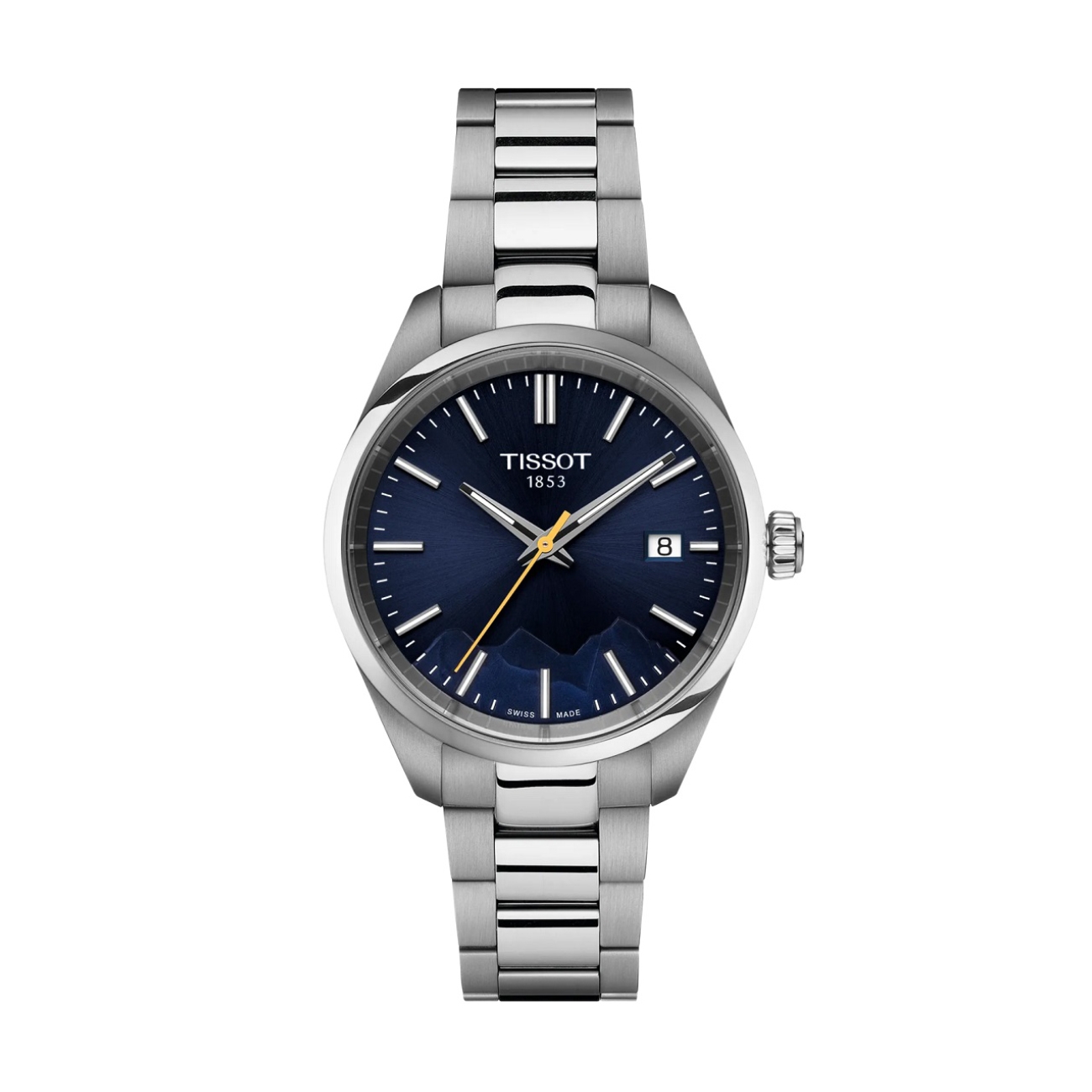 Ceasul Tissot Jungfrau Special Edition emană eleganță și caracter, inspirat de măreția muntelui Jungfrau. Cadranul albastru adânc, cu un finisaj satinat și o gravură subtilă a conturului muntelui, creează un efect vizual deosebit. Acul secundar galben oferă un contrast vibrant, aducând energie designului sobru.