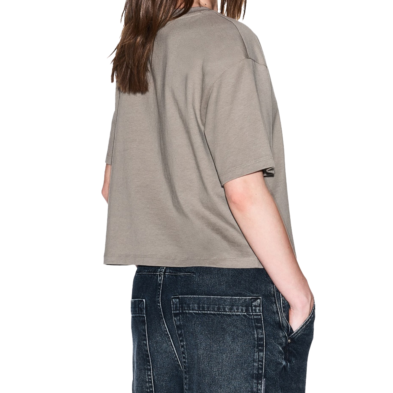 Tricou cropped Armani Exchange realizat din bumbac elastic, cu o croială lejeră și ușor scurtată, perfectă pentru un look casual și relaxat. Modelul se remarcă prin logo-ul frontal strălucitor, format din mici cristale care adaugă o notă de feminitate și stil. Mâneci scurte, linie ușor amplă și guler rotund, toate contribuie la un design modern și confortabil, ideal pentru a fi purtat cu jeanși cu talie înaltă sau pantaloni largi pentru un outfit urban de impact.