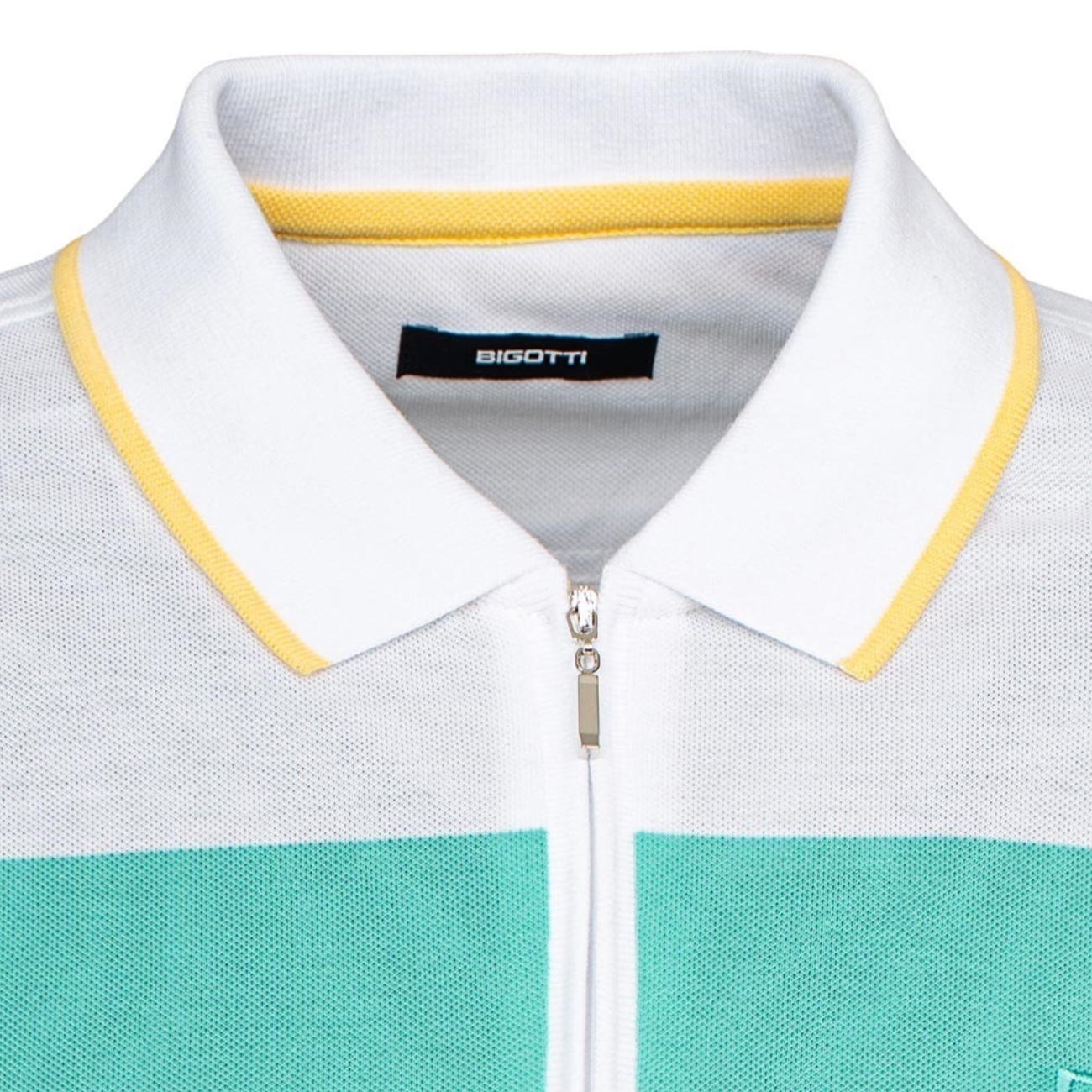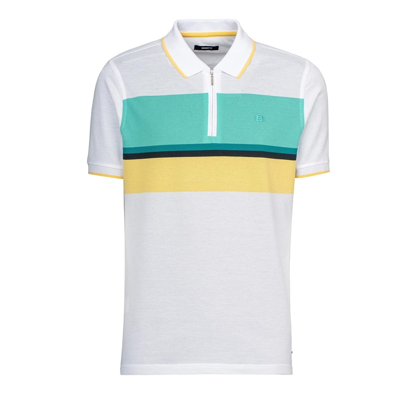 Tricou polo casual realizat din bumbac 100%, cu un design modern în dungi late color-block în nuanțe de alb, galben, turcoaz și bleumarin. Gulerul cu detalii contrastante și închiderea cu fermoar adaugă o notă sportivă și contemporană, iar croiala confortabilă îl face ideal pentru ținutele relaxate de vară.