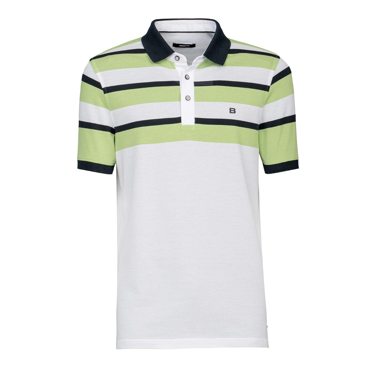 Tricou polo casual, realizat din bumbac 100%, cu un design în dungi late orizontale în nuanțe de alb, verde deschis și bleumarin. Gulerul clasic contrastant și nasturii din zona pieptului adaugă o notă rafinată și versatilă, perfectă pentru ținute lejere de vară. Logo-ul „B” brodat discret pe piept întărește identitatea de brand.