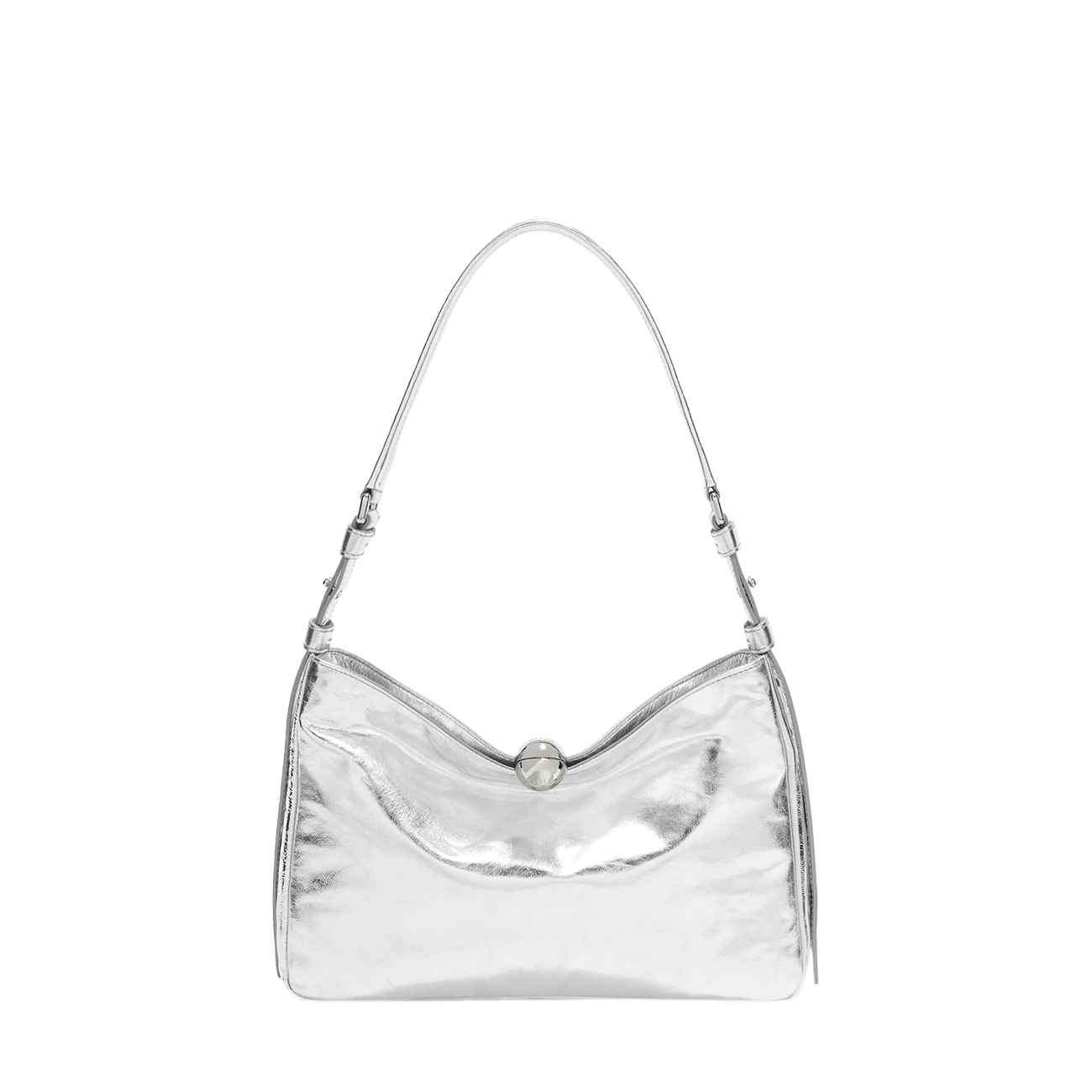 Noua geantă Sfera Soft impresionează prin silueta sa minimalistă și liniile curate, reflectând o estetică modernă și sofisticată. Realizată din napa metalizată moale, cu un efect craquelé luminos, această geantă creează o textură șifonată subtilă, adăugând un plus de rafinament oricărui outfit. Forma ergonomică urmărește armonios curbura brațului, asigurând confort maxim la purtare.