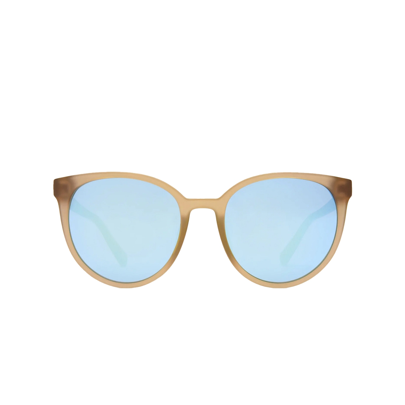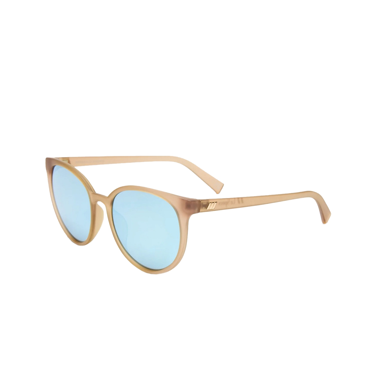 Ochelarii de soare Le Specs se remarcă prin designul contemporan și cromatica îndrăzneață. Rama este realizată din plastic mat într-o nuanță de bej-gri deschis, cu un finisaj translucid ce adaugă un aer modern și ușor minimalist. Lentilele din policarbonat, în tonuri de albastru deschis, oferă protecție UV completă și un efect de oglindă subtil, perfect pentru zilele însorite de vară.
