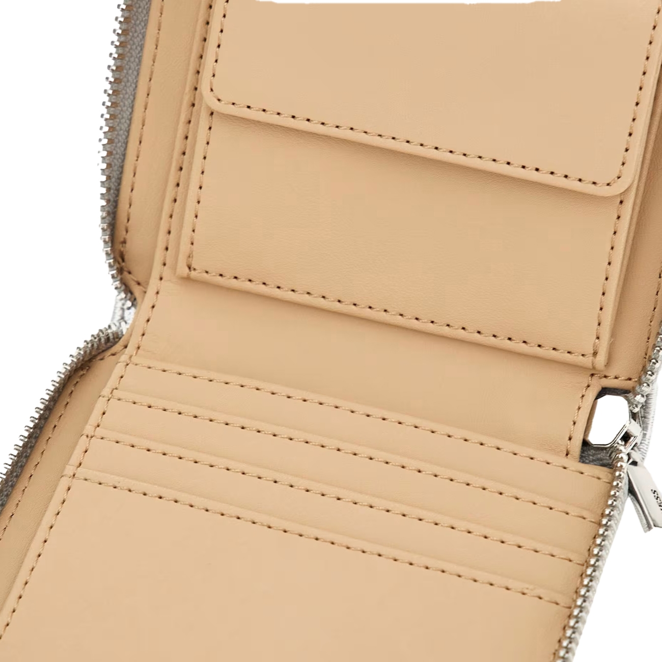 Portofelul GUESS Aldina Laminated Mini Wallet strălucește subtil prin interior, cu o textură lucioasă distinctă și închidere cu fermoar, ideală pentru acces rapid la esențialele tale. Interiorul este organizat armonios: include un spațiu principal și un buzunar intern pentru monede, asigurând ordine fără compromis. Logo-ul GUESS este aplicat cu finețe, adăugând un plus de rafinament. Este companionul compact perfect pentru un stil de viață elegant și practic.